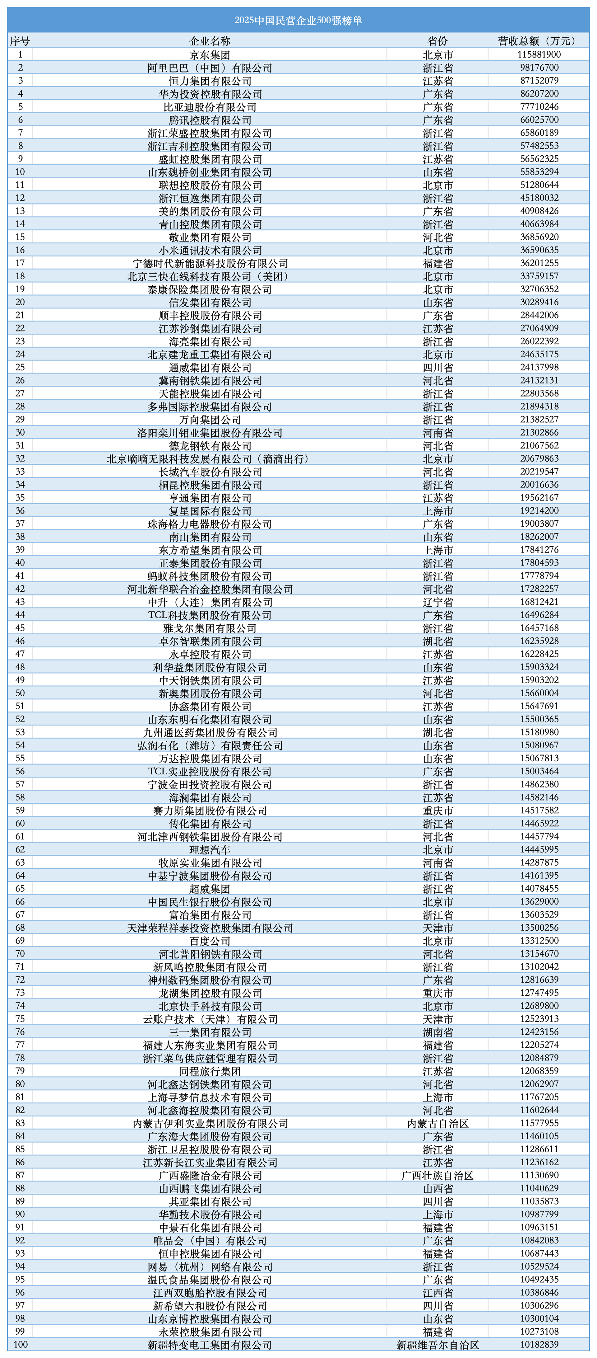 全國工商聯(lián)28日在遼寧沈陽發(fā)布“2025中國民營企業(yè)500強”。京東集團、阿里巴巴(中國)有限公司、恒力集團有限公司位居前三。